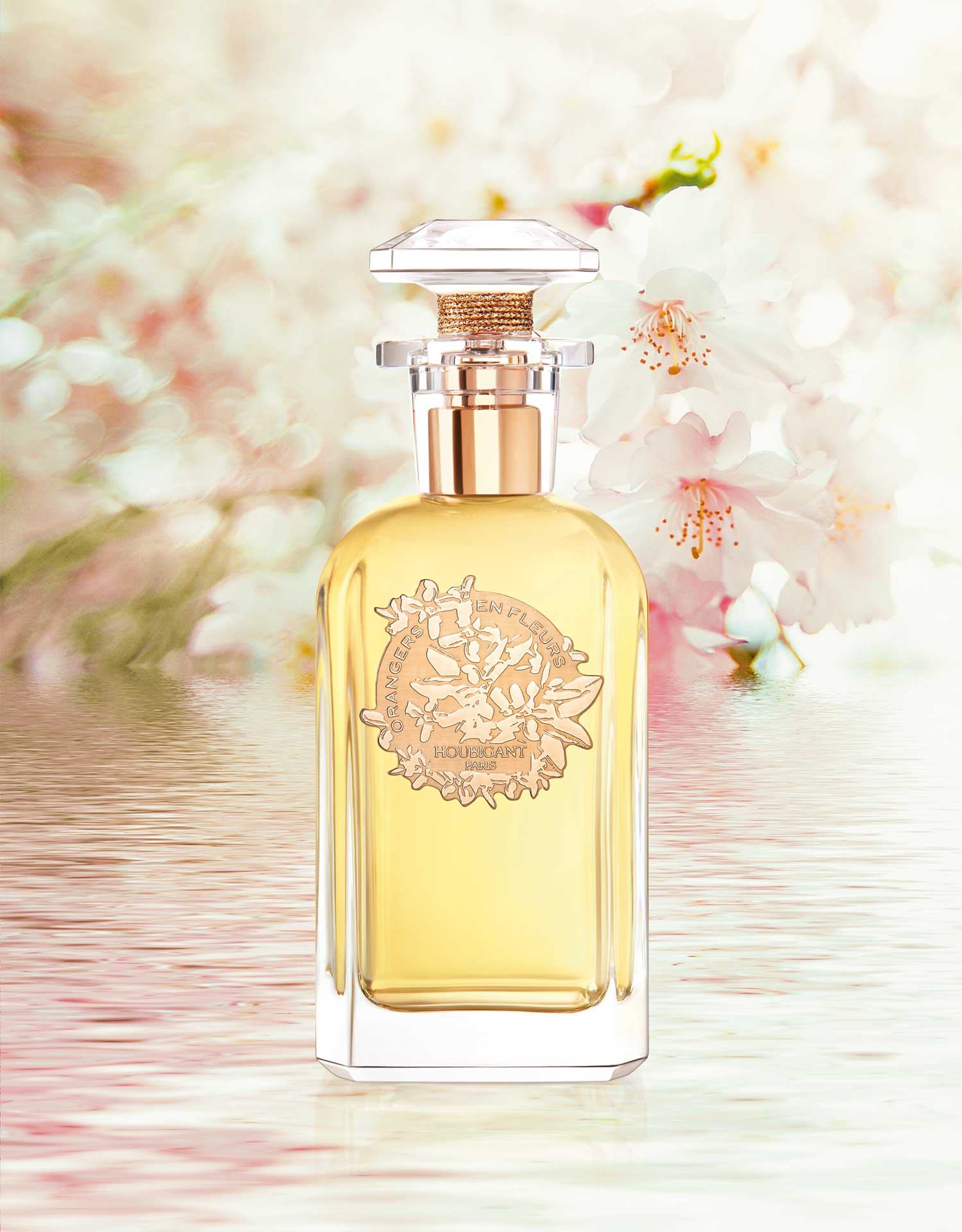 Con su elegante y multifacético ramo de flores de Azahar, Orangers en Fleurs aprovecha su herencia real, florecida a la perfección.El rediseño del frasco de cristal es un homenaje honorífico a su botella original de principios del siglo XX que había sido diseñada y fabricada por Baccarat para la Casa Houbigant con motivo del Parfum Idéal en la Exposición Universal de París de 1900. La impecable y minimalista caja blanca está estampada con un logotipo dorado de estilizadas flores de Azahar